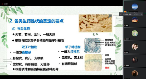 本次教学观摩课的主讲教师是史雯慧老师和张乐老师,讲授的课程分别是《分析化学》和《药用植物学与生药学》。两位青年教师授课自然娴熟,备课认真详实,知识量大,充分利用现代教学手段,线上课堂气氛活跃,具有较强的感染力。同时,教学流程设计流畅,能够结合不同的教学环节使用合适的教学技巧与方法,达到了较好的教学效果。