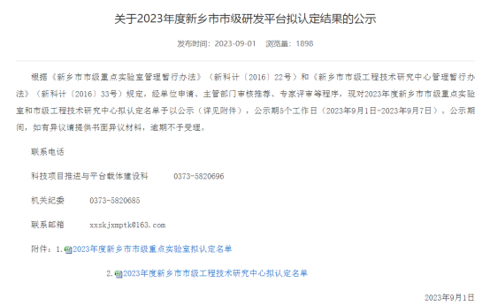 9月1日,新乡市科技局网站公示了2023年度新乡市市级重点实验室和市级工程技术研究中心拟认定名单,我院申报的“新乡市药物精准修饰工程技术研究中心”顺利获批,中心主任徐绍红教授。这是我院建院以来获批的第一个工程技术研究中心,也是2023年我校获批的唯一一个工程技术研究中心。中心针对当前生物与医药行业发展现状和面临的挑战,围绕生物活性杂环分子的精准绿色合成和产业化开展研究,有助于聚集相关领域的高层次人才,立足新乡,辐射中原,放眼全国,提升小分子药物的研究水平和创新能力。