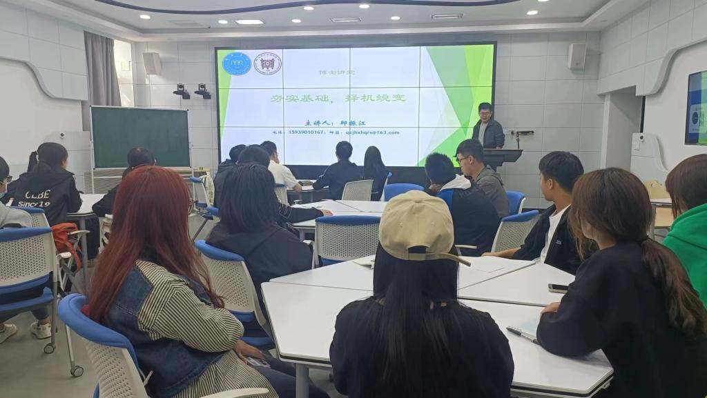 邱振江博士以“夯实基础,择机蜕变”为主题展开讲座,以自身的教育背景为切入点进行主题讲述,引导同学们要在大学期间学好专业知识,夯实自己的基础,树立远大理想并且为之奋斗,结合自己在硕士期间的研究课题与同学们分享科研的经验、体会,号召同学们积极投身科学研究,努力在实现高水平科技自立自强的实践中做出自己的贡献,同时对同学们提出的问题一一进行解答,并提出许多针对性建议。