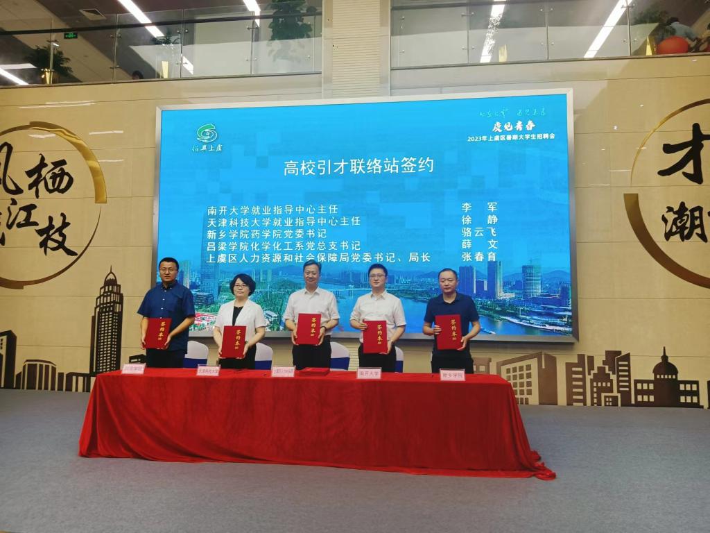 在绍兴市上虞区“虞见青春2023年暑期大学生招聘会”上,骆云飞代表学院与上虞区人社局签订高校引才联络站协议,带领毕业生代表们与参会的82家用人单位面对面交流,并现场指导学生开展就业实践,教育引导学生从实际出发选择职业和工作岗位。