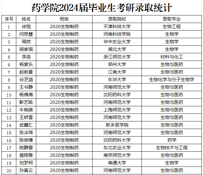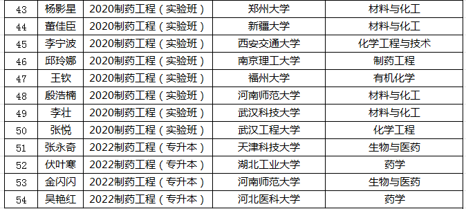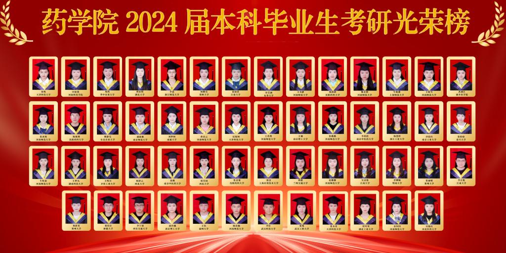 在今年的考研中,我院学子们展现出了强大的竞争力和深厚的学术素养。他们不仅在专业课上取得了优异的成绩,更在复试中展现出了优秀的综合素质和创新能力。我院2024届本科毕业共有54人拟录取为硕士研究生,其中普通本科毕业生115人中共有50人被录取,录取率为43.48%。制药工程1班考研录取率为51.72%;制药工程(实验班)考研录取率为50%,其中李宁波等9人被西安交通大学等“双一流”大学录取,“双一流”大学录取率为32.14%。录取人数和录取率均创下了历史新高。