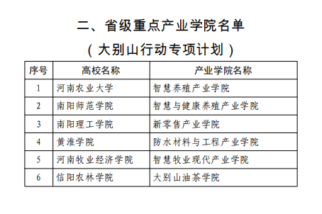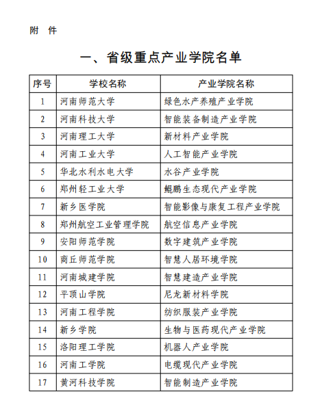 根据《河南省教育厅河南省工业和信息化厅关于开展省级重点现代产业学院建设的通知》(教高〔2021〕6号)要求,经高校申报、专家评审、现场答辩和网上公示,决定立项建设河南师范大学绿色水产养殖产业学院等23所产业学院为省级重点现代产业学院(含大别山行动专项产业学院6所,名单见附件)。现将有关事宜通知如下: